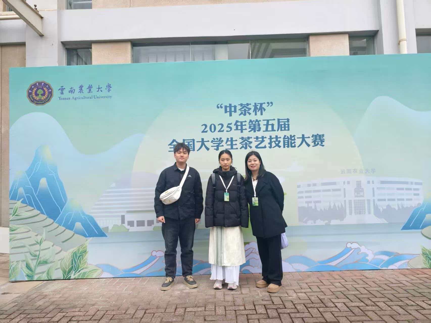 近日,“中茶杯”2025年第五届全国大学生茶艺技能大赛在云南农业大学圆满落幕。本次大赛由高等学校国家级实验教学示范中心联席会主办,汇聚了全国26所高校的226位优秀选手,以“传承创新·技艺融合·文化交流”为宗旨,搭建起全国高校茶文化交流与技艺比拼的高端平台。南京农业大学学子谷澍、何颖琳怀揣对中华茶文化的赤诚热爱,在赵真老师的带领下,分别征战个人赛B组(品饮茶艺)与A组(自创茶艺)赛道,凭借扎实的专业素养与饱满的精神风貌圆满完成赛事,均荣获个人赛优秀奖,展现了南农学子在茶文化传承与创新中的青春担当。
